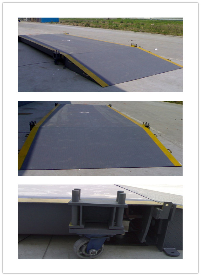秤臺超低外型設(shè)計,抗沖擊能力強;斜坡與秤體一體化設(shè)計,合適的爬坡角度,使車輛輕松上秤稱重,獨特的秤臺液壓升高導(dǎo)向系統(tǒng)及特制的超重載萬向移動輪,保證秤臺輕快靈活地移動。